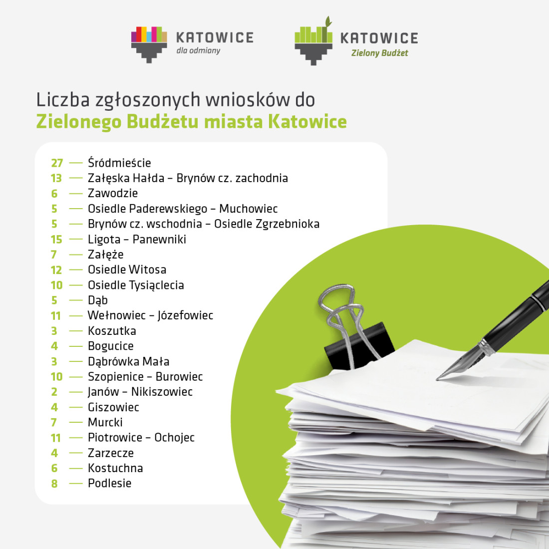 Najwięcej pomysłów na swoją dzielnicę zgłosili mieszkańcy Śródmieścia (27), Ligoty – Panewnik (15) i Załęskiej Hałdy – Brynowa cz. zachodniej (13). Dwie osoby w tegorocznej edycji złożyły aż po 10 wniosków – zarówno dla swojej dzielnicy (dla Śródmieścia i Piotrowic-Ochojca), jak i miasta.